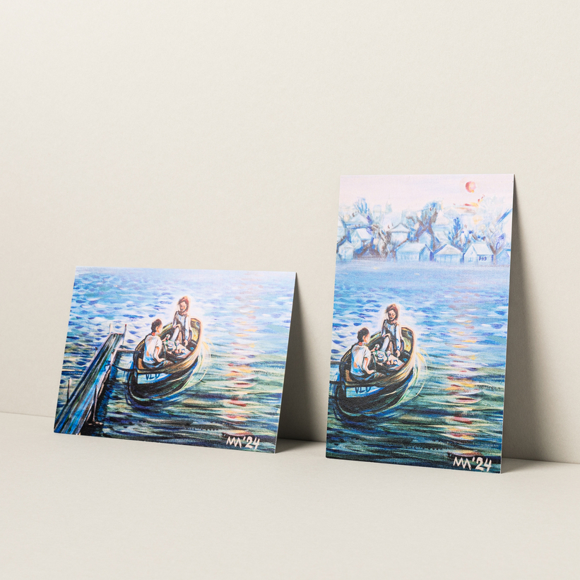 Klassikalises mõõdus postkaardid Viljandi paadimehega on loodud minu 2024.a valminud ruudu-kujulisest maalist.